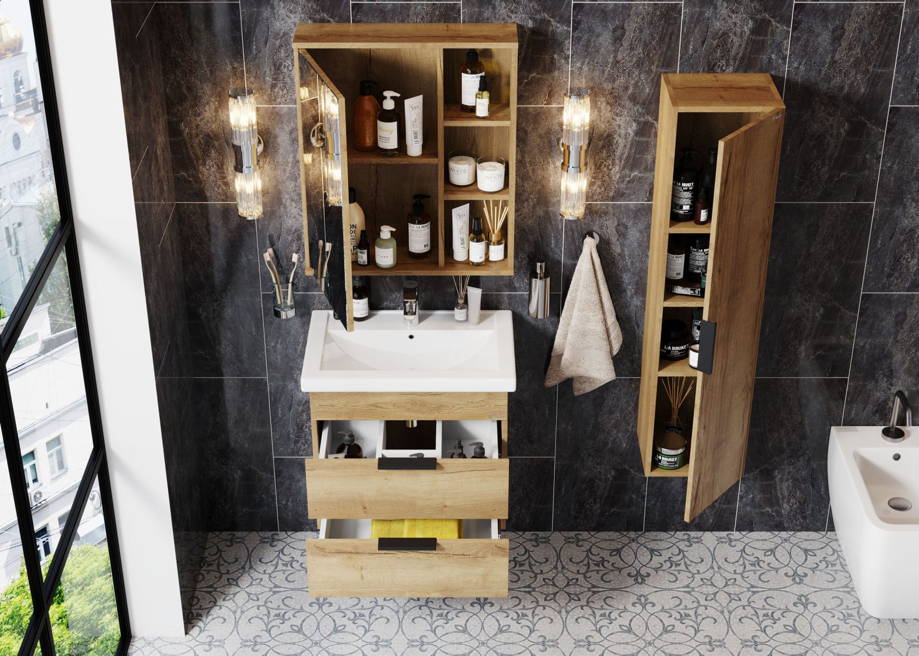 Подвесной пенал для ванной комнаты Onika ЛЕГРАН 30 - это сочетание насыщенного древесного декора и благородства металла: роскошная текстура и натуральный цвет дуб галифакс дают теплоту, а матовая металлическая ручка добавляет урбанизма и солидности.