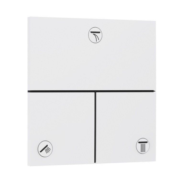 Hansgrohe ShowerSelect Comfort E 15573700 Запорно-переключающий вентиль на 3 положения (белый матовый). Внешняя часть. Внутренняя (скрытая) часть арт. 01500180 приобретается отдельно. 3 функции; одновременное использование нескольких розеток; комфортное включение/выключение потребителей с помощью большого Select-рычага; пуск/остановочный клапан для управления функциями; максимальный расход при 3 бар: 32 л/мин.; расход верхнего выхода: 26 л/мин; расход нижнего выхода: 26 л/мин; мин. рабочее давление: 1 бар; макс. рабочее давление: 10 бар; плоская розетка для большего пространства в душе; накладка может быть выровнена на +/- 3°; простая установка благодаря предварительно собранному функциональному блоку; материал кнопки: металл; тип подключения: базовый комплект iBox Universal 2 (#01500180); клапан поставляется с кнопками: Rain small, Rain large, ручной душ, Waterfall, излив на ванну.