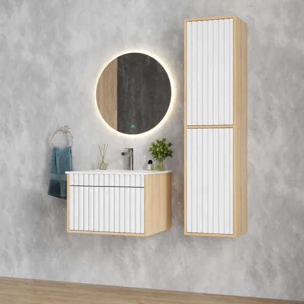 Рифленый белый матовый фасад с покрытием SoftTouch и корпус цвета дуба с роскошной текстурой подчеркнет изысканный вкус владельца и станет центральным элементом декора.