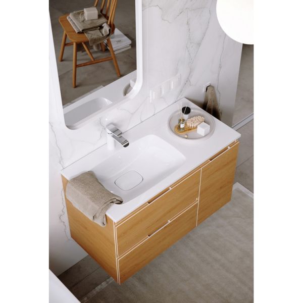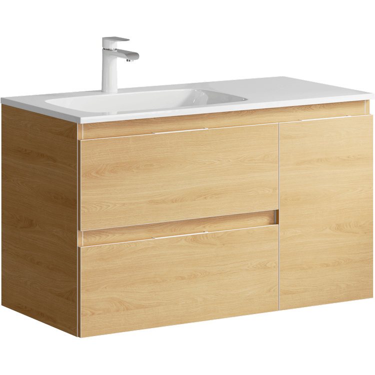 Подвесная тумба под раковину Aqwella Accent ACC0109LDZ 90 смПодвесная тумба с двумя ящиками и одной дверью в цвете дуб золотой с умывальником из литьевого мрамора (чаша слева)