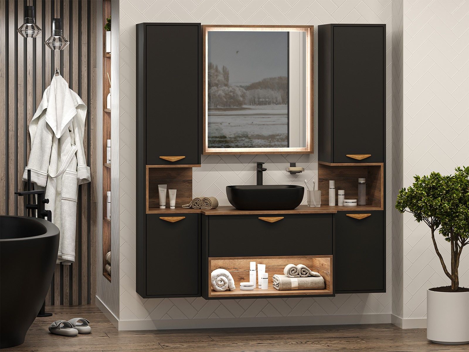 Подвесная тумба под раковину Brevita Bergen BER-07080-19-02-1Я с подсветкой 80см дуб Галифакс олово/чёрный купить
