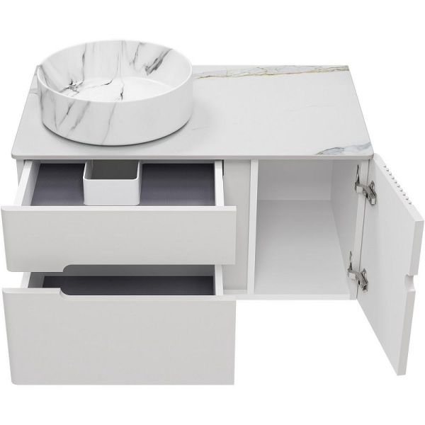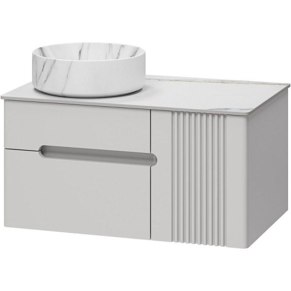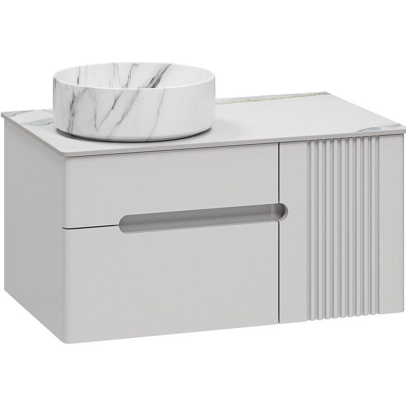 Тумба с раковиной Brevita Pallisandro 80 УТ000025399 подвесная. Pallisandro - когда эстетика встречается с функциональностью. Коллекция создана для ценителей утончённого дизайна и продуманных деталей. Здесь всё подчинено принципу элегантного минимализма: лаконичные фасады в эмали, изысканная фрезеровка на дверце и отсутствие внешней фурнитуры для чистоты линий. Главный акцент коллекции — столешницы из керамогранита, устойчивые к влаге, механическим повреждениям и химическим веществам. Накладные раковины гармонично завершают современный образ. Внутреннее пространство продумано до мелочей: ящики оснащены доводчиками скрытого монтажа, что обеспечивает плавное закрывание, а противоскользящие коврики внутри ящиков позволяют хранить вещи в идеальном порядке. Благодаря подвесному монтажу, мебель смотрится легко, а уборка становится удобнее. Pallisandro - это премиальный комфорт, который чувствуешь в каждой детали. Характеристики: Тумба под раковину: