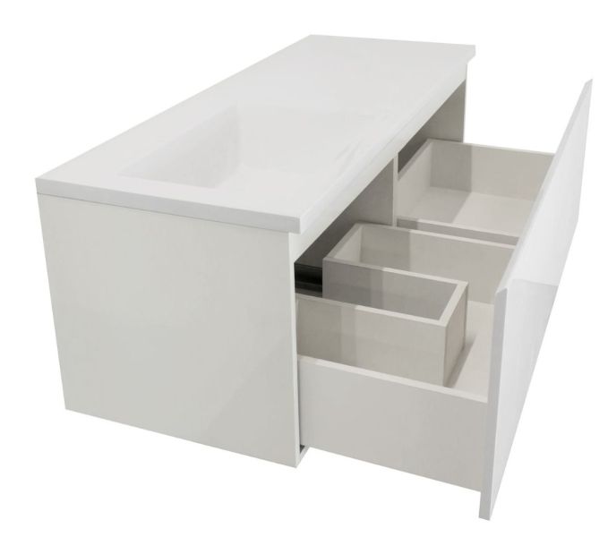 Коллекция мебели для ванной комнаты Dallas Luxe покоряет своей удивительной простой и функциональностью. Современная тумба укомплектована раковиной из литьевого мрамора с удобной чашей. Стиральная машина устанавливается под столешницей, за счет чего экономит место в ванной комнате. В тумбе имеются два ящика. Нижний ящик тумбы – широкий и вместительный – предназначен для крупных предметов, а в верхнем имеется специальная организация пространства, позволяющая хранить мелкие вещи. Подвесная система монтажа позволяет более эффективно использовать пространство, не мешает уборке в ванной комнате.
