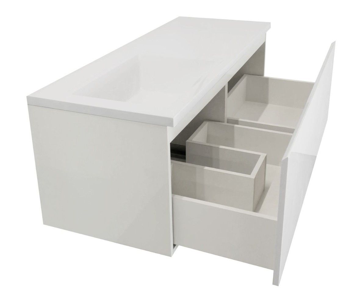Отличительной особенностью коллекции Dallas Luxe является один большой функциональный ящик, который располагается по всей длине раковины. Ящик разделяется на две зоны, тем самым дает возможность хранения как крупных, так и мелких вещей. Стильная тумба впишется в любой современный интерьер и создаст комфорт в использовании. Подвесная система монтажа позволяет более эффективно использовать пространство, не мешает уборке в ванной комнате, не нарушает раскладку плитки на полу.