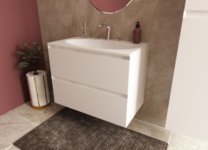 К тумбе приобретается раковина из литьевого мрамора, плавно перетекающая в овальную чашу, которая добавляет изящность мебели и передает атмосферу стиля. В тумбе расположены 2 вместительных ящика, интегрированные ручки выполнены за счет скошенных фасадов. Мебель выполнена из влагостойкого ЛДСП и качественного MDF с использованием эмали RENNER (Италия). Ящики снабжены системой плавного закрывания. Для мебели используется фурнитура Samet (Турция).