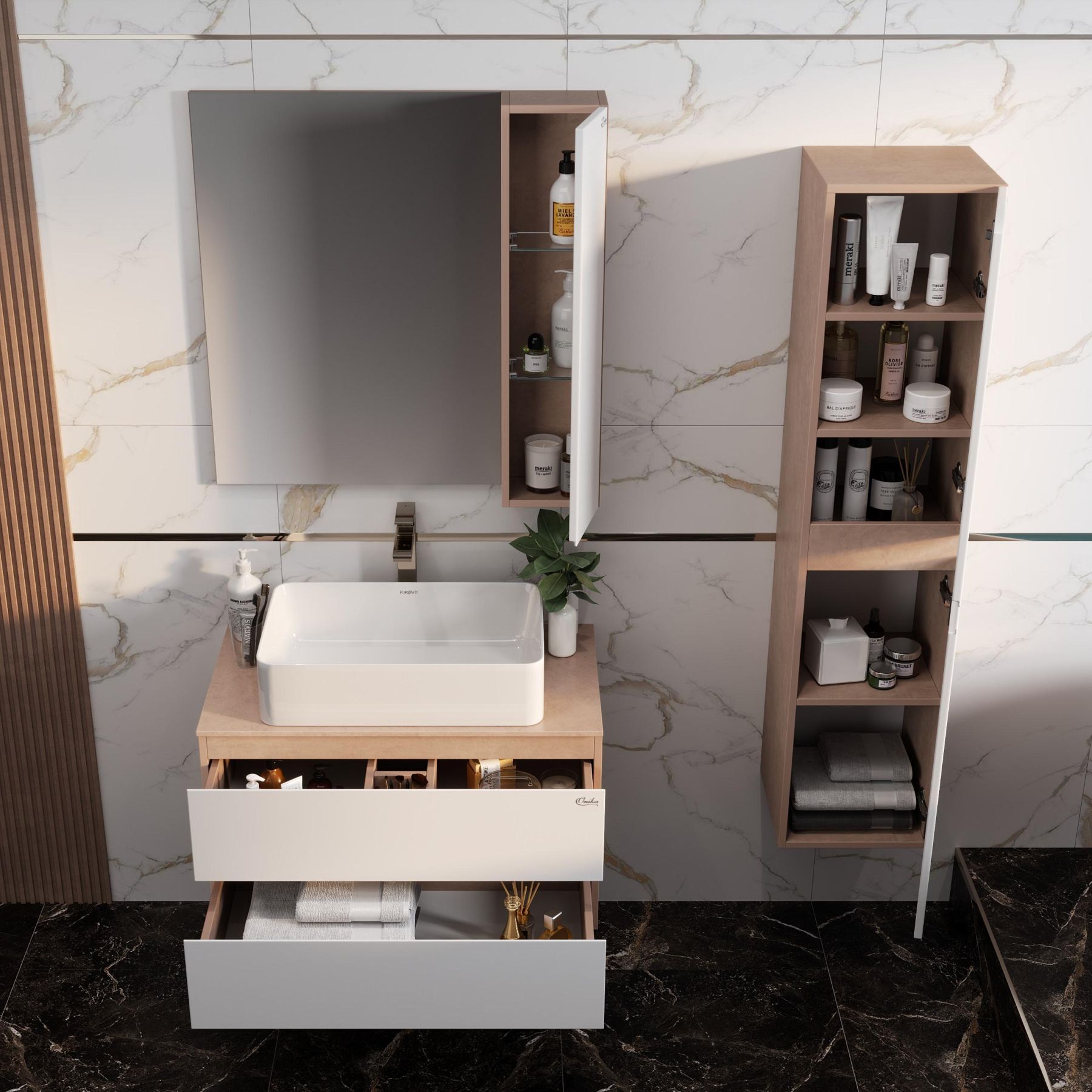 Подвесная тумба Onika Алеста 80 отражает актуальные тенденции в дизайне мебели для ванной комнаты: минимализм и геометрия фасадов, белый глянец и текстура бетонного камня, отсутствие декора, столешница из керамогранита и накладная раковина.