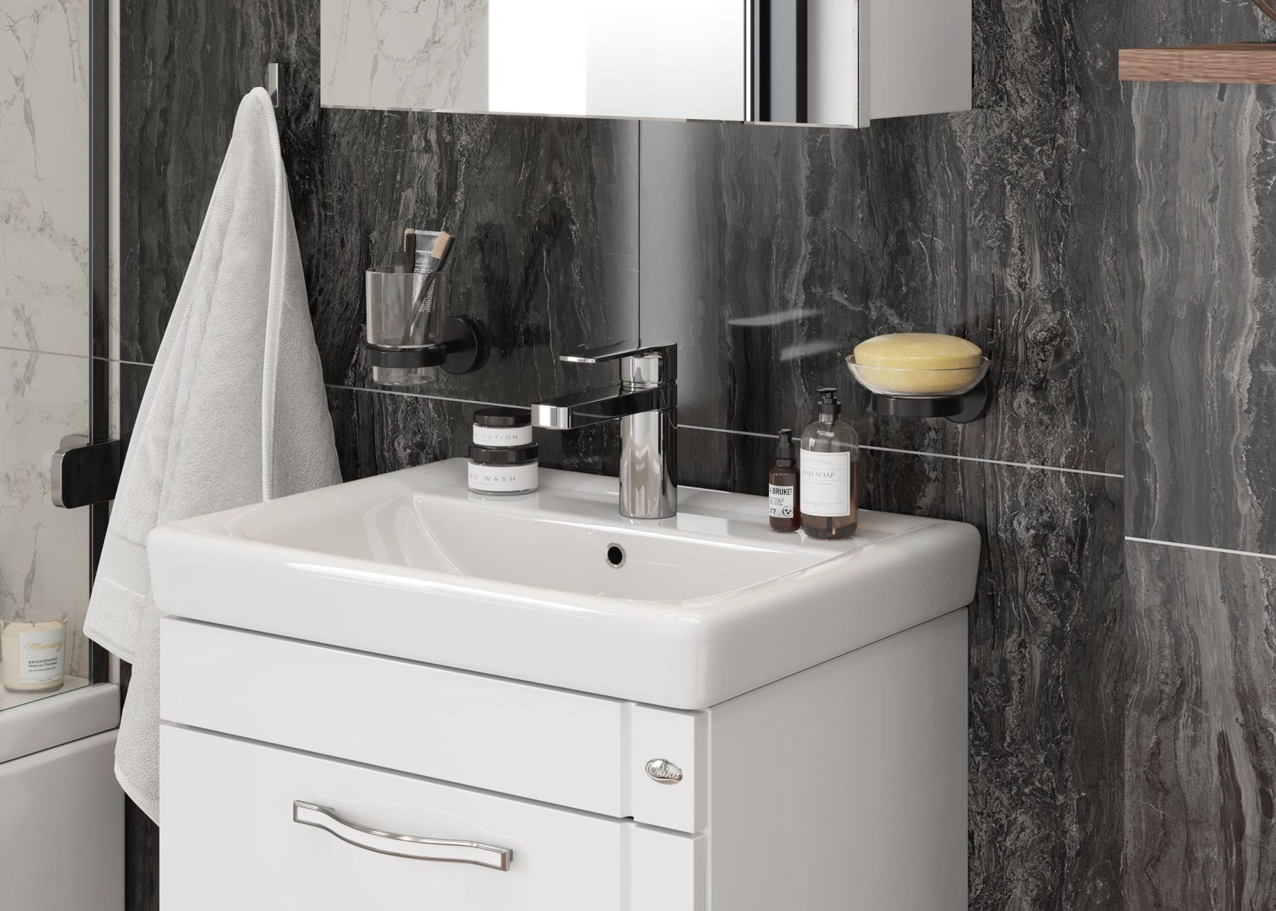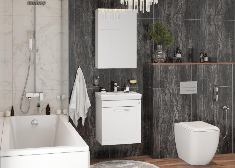 Подвесная конструкция и компактные габариты подойдут для оформления небольшого пространства, а простой дизайн с изящной фрезеровкой и сверкающей дизайнерской ручкой гармонично впишется в любую ванную комнату.