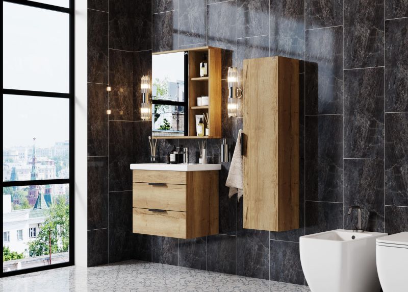 Подвесная тумба для ванной комнаты Onika Легран 70 - это сочетание насыщенного древесного декора и благородства металла: роскошная текстура и натуральный цвет дуба дают теплоту, а матовые металлические ручки добавляют урбанизма и солидности.