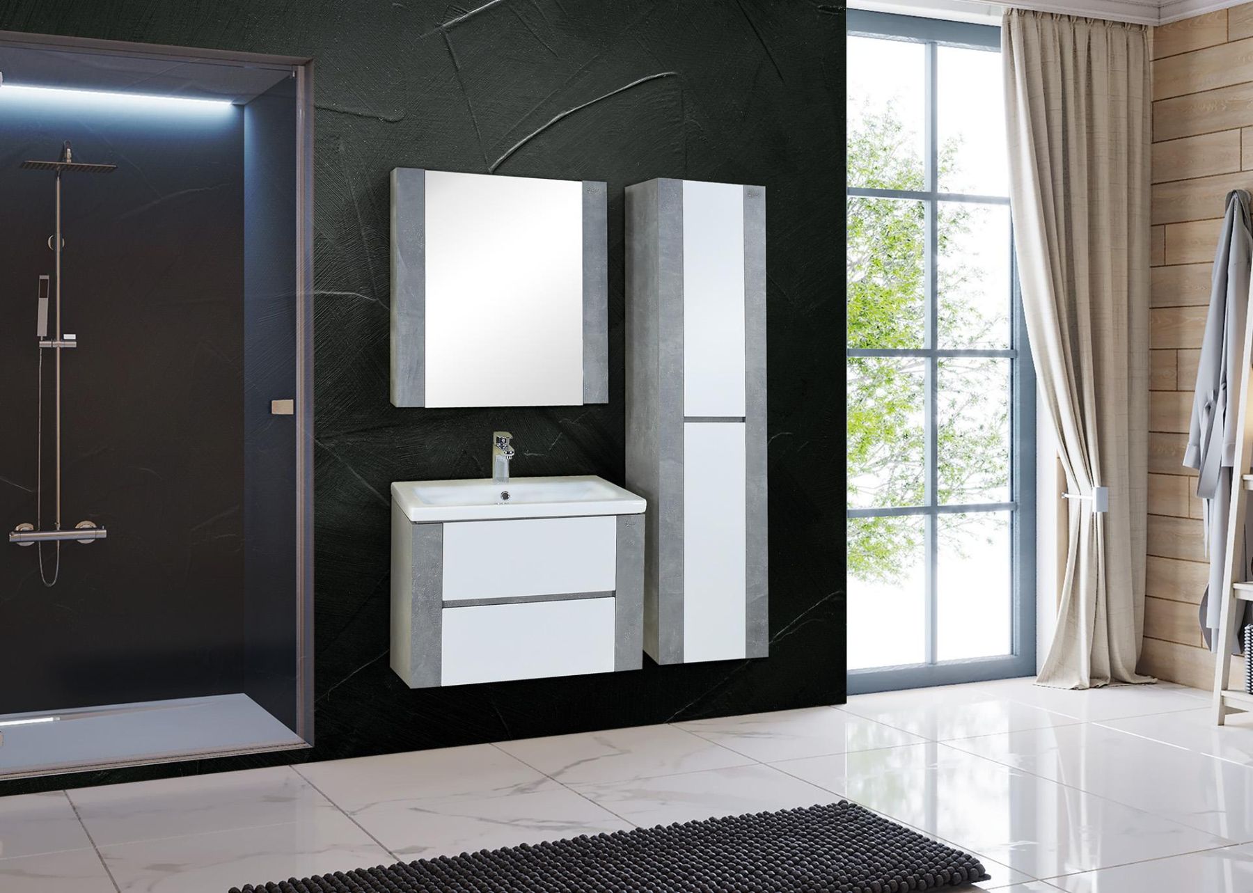 Подвесная тумба Стоун 70 отражает актуальные тенденции в дизайне мебели для ванной комнаты: минимализм и геометрия фасадов, чёткость и лаконичность форм, отсутствие декора и стильный цвет выбеленного бетонного покрытия.