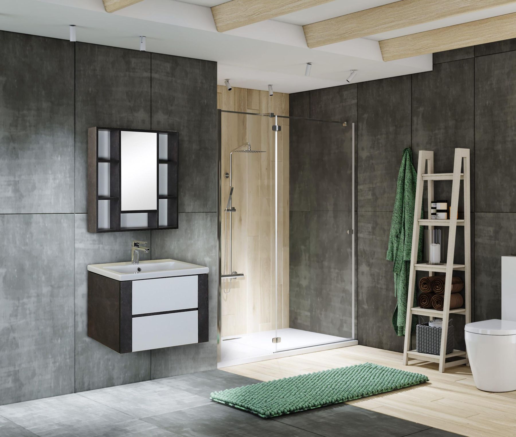 Подвесная тумба Стоун 70 отражает актуальные тенденции в дизайне мебели для ванной комнаты: минимализм и геометрия фасадов, чёткость и лаконичность форм, отсутствие декора и стильный цвет темного бетонного покрытия.