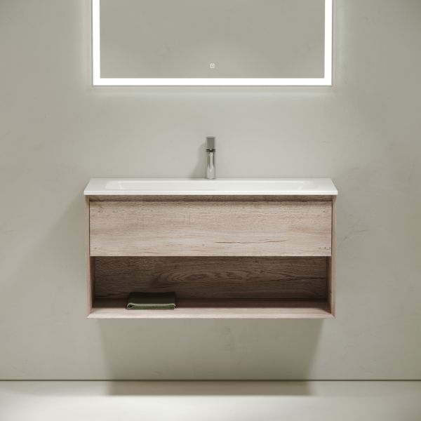 Тумба подвесная SANCOS Marmi 1.0 995х445х520 c одним ящиком оснащенным доводчиками скрытого монтажа с системой Soft close (плавного закрывания) и открытой нишей, c фрезерованной ручкой по всей длине фасада, дуб галифакс натуральный, арт. MR1.0100EG