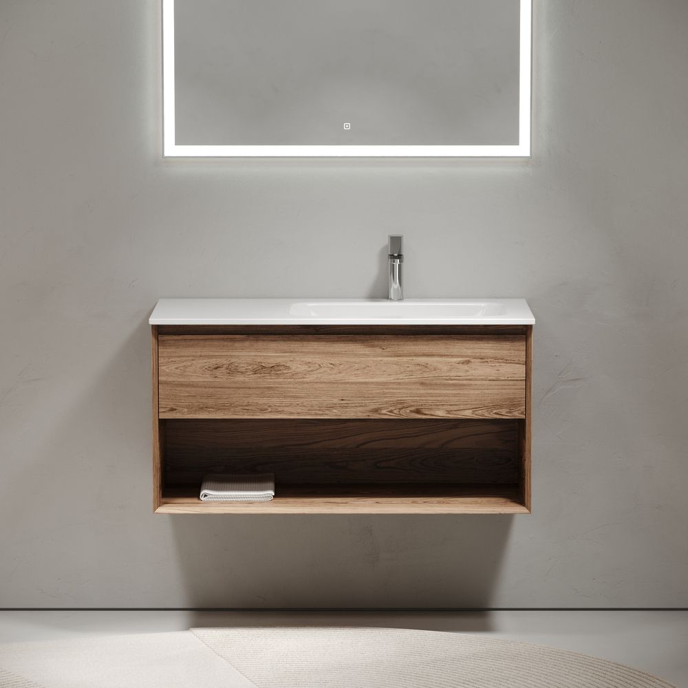 Тумба подвесная SANCOS Marmi 1.0 правая, 995х445х520 левая, c одним ящиком оснащенным доводчиками скрытого монтажа с системой Soft close (плавного закрывания) и открытой нишей, c фрезерованной ручкой по всей длине фасада, дуб чарльстон, арт.MR1.0100RECH