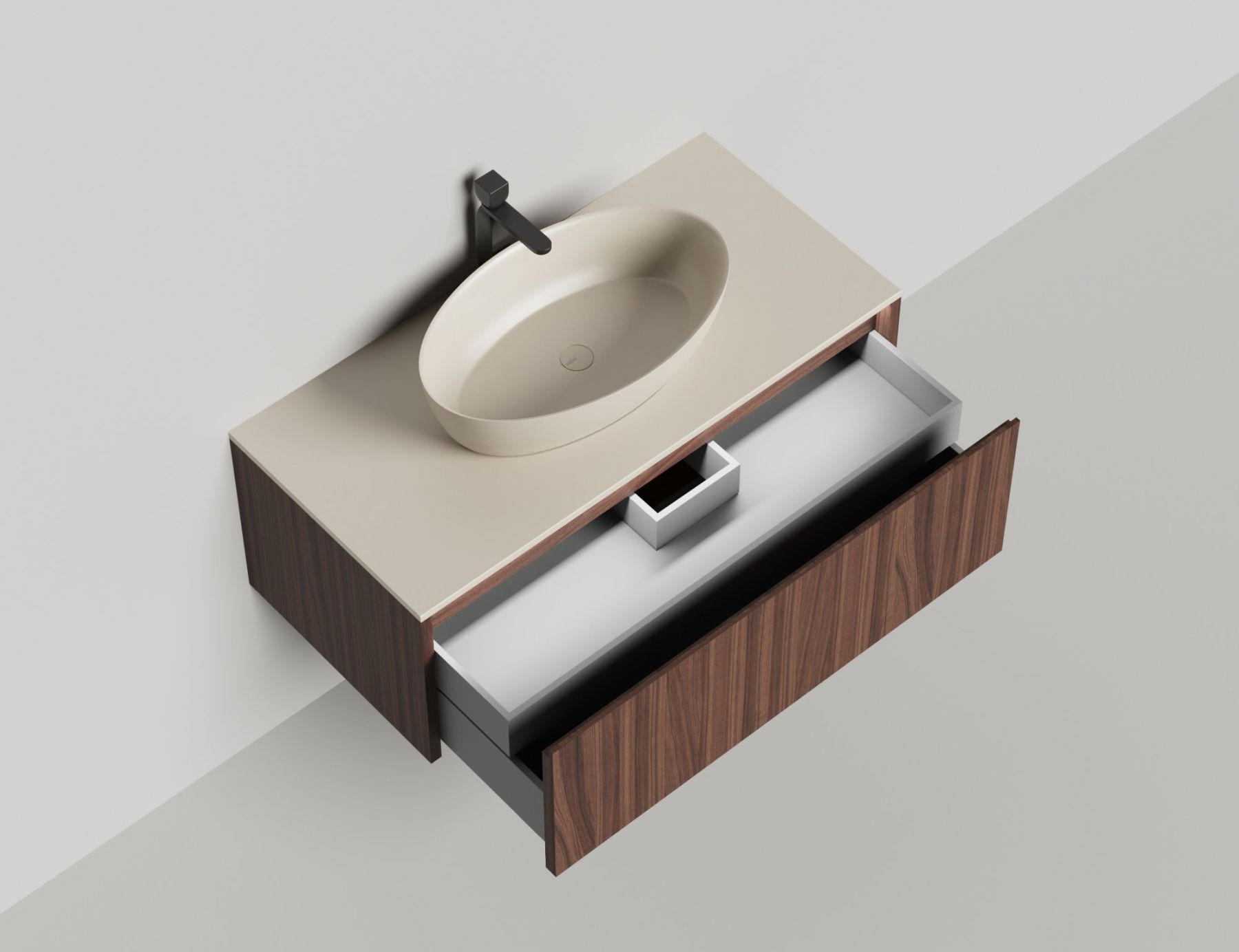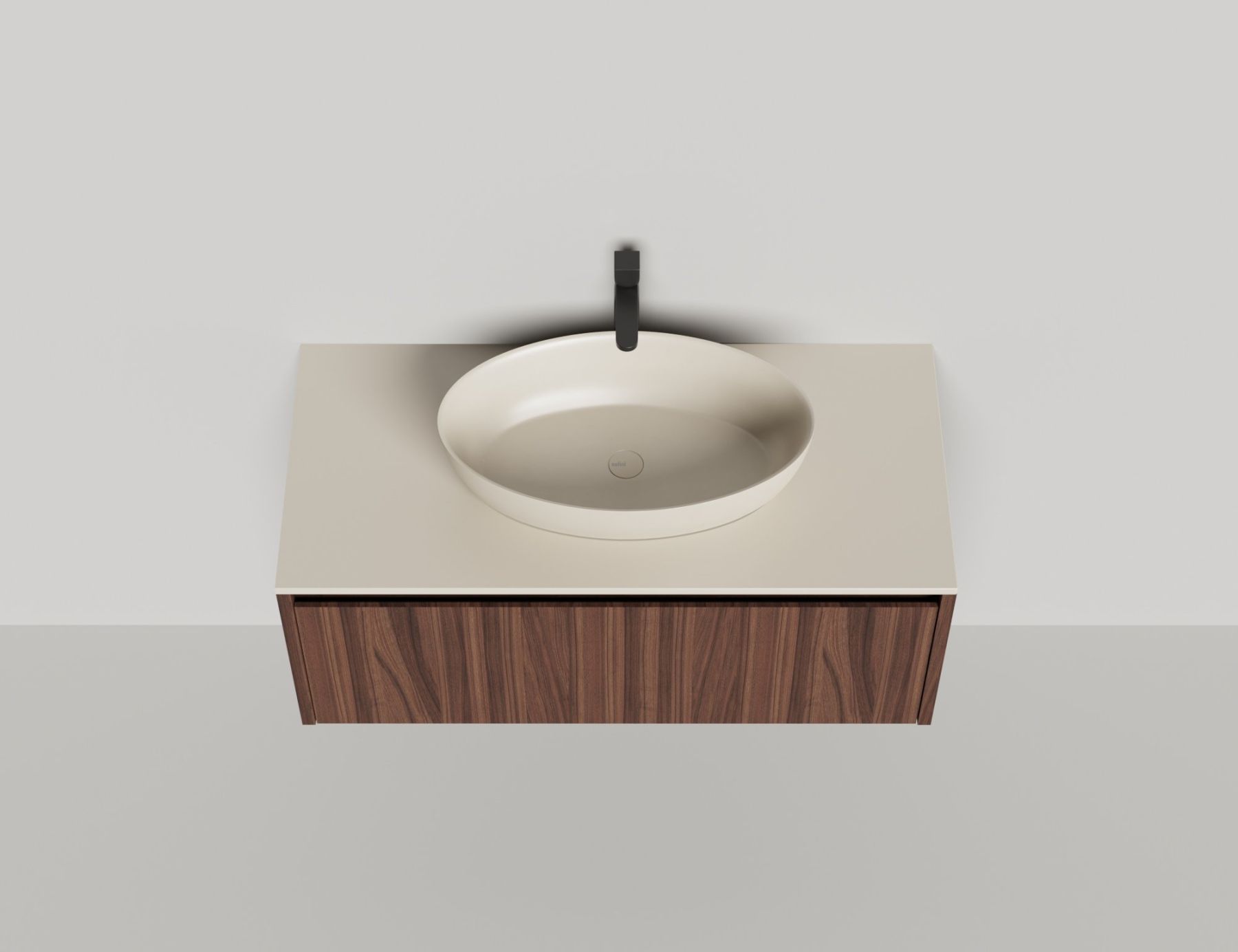 • Тумба и столешница из материала S-Stone в сборе (накладные раковины укомплектованы донным клапаном и поставляются в отдельной коробке)