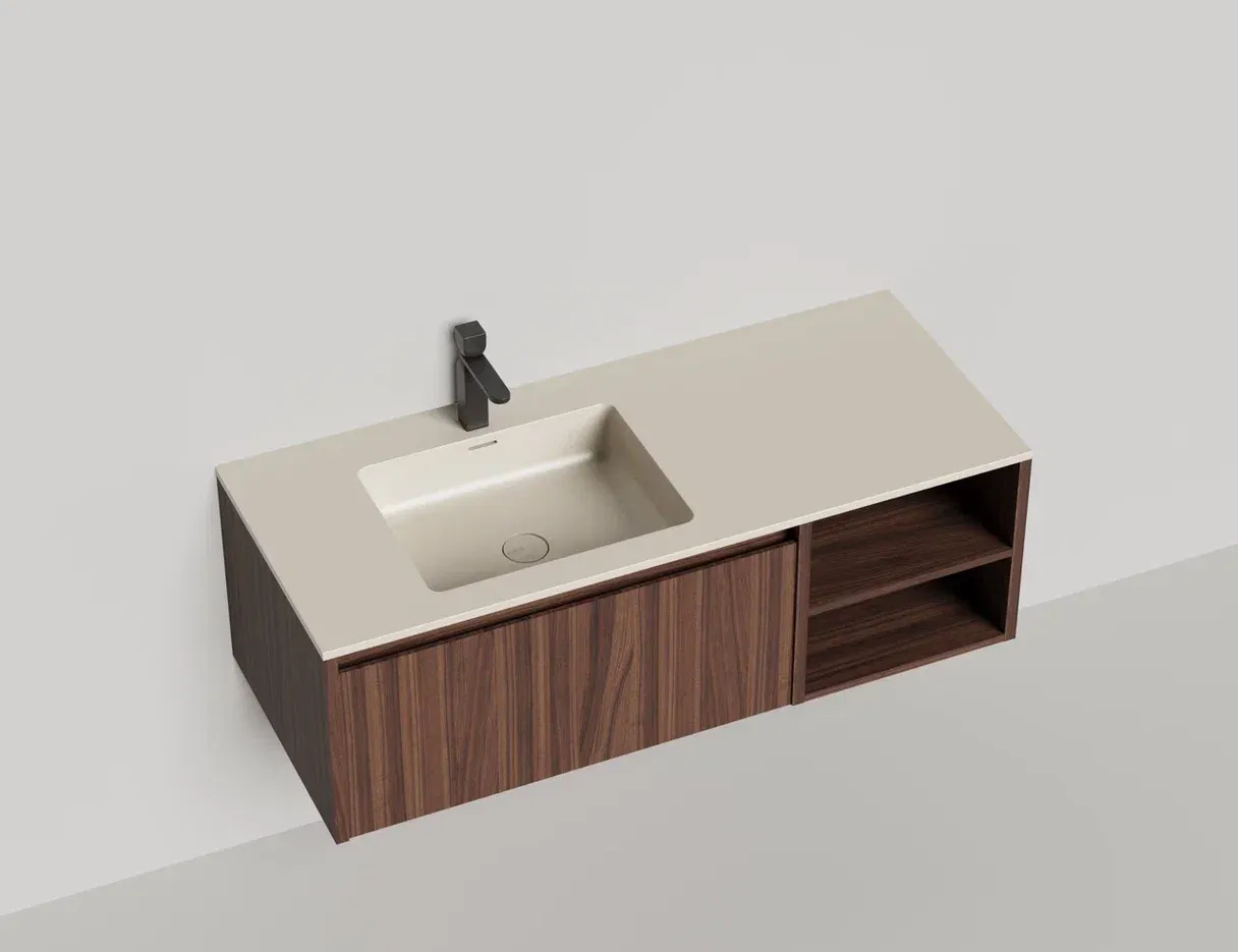 - Тумба и столешница из материала S-Stone в сборе (накладные раковины укомплектованы донным клапаном и поставляются в отдельной коробке)