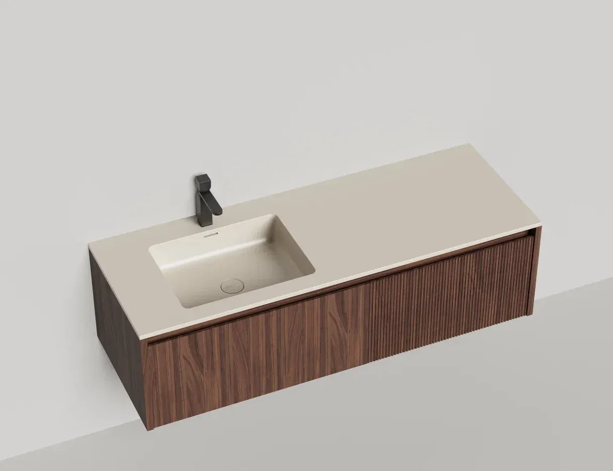 • Тумба и столешница из материала S-Stone в сборе (накладные раковины укомплектованы донным клапаном и поставляются в отдельной коробке)