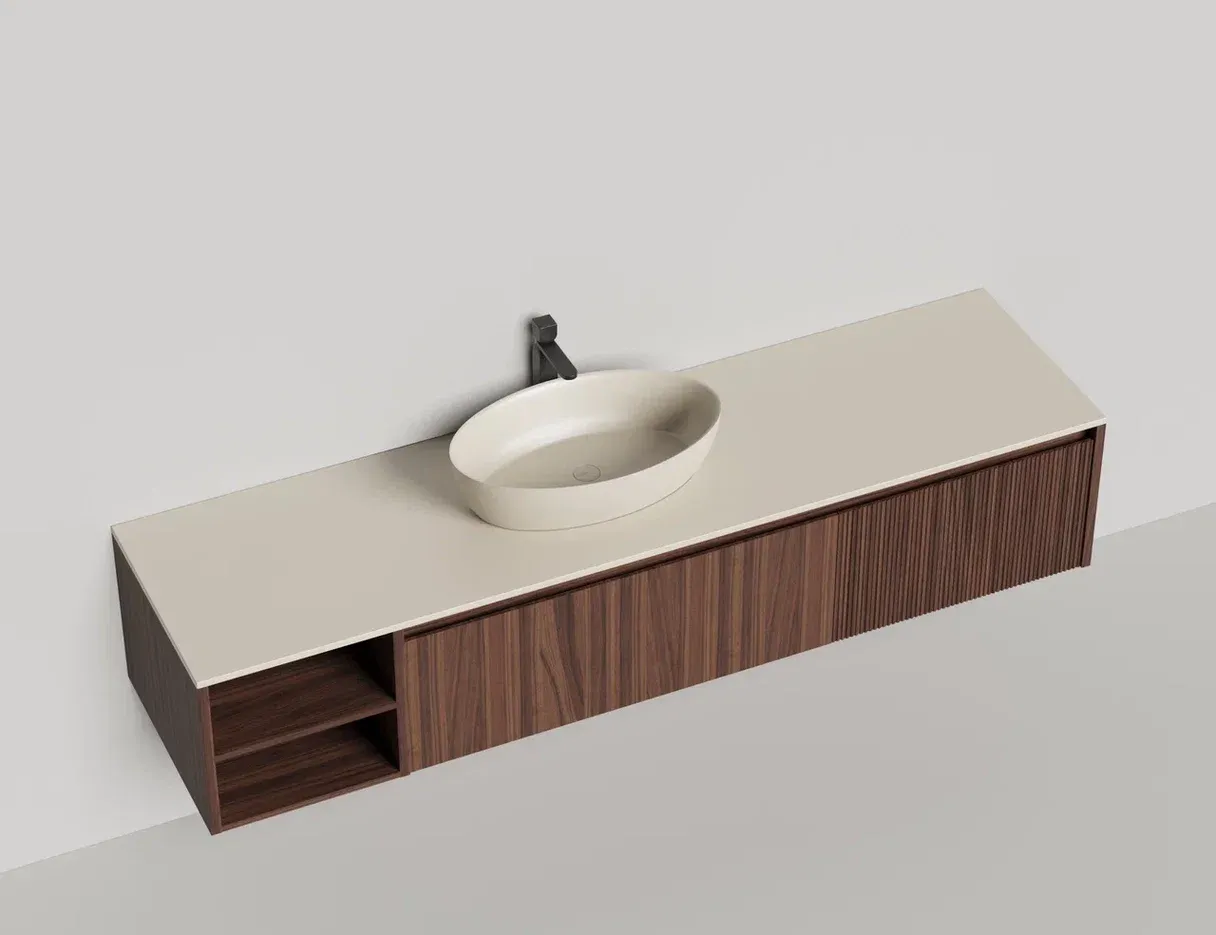 • Тумба и столешница из материала S-Stone в сборе (накладные раковины укомплектованы донным клапаном и поставляются в отдельной коробке)