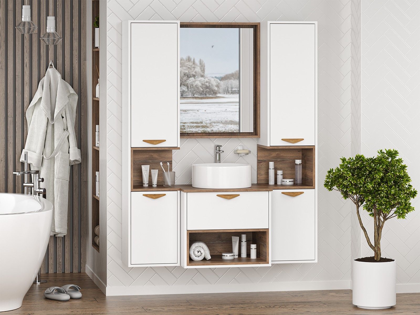 Шкаф-пенал для ванной комнаты – это стильное решение, которое гармонично вписывается в современный интерьер. Его элегантные линии и аккуратные формы создают атмосферу чистоты и порядка, что особенно важно в таком интимном пространстве. Изготовленный из качественных влагостойких материалов, этот шкаф обеспечивает долговечность и надежность, даже в условиях повышенной влажности.Основное преимущество шкаф-пенала заключается в его вместительности. Удобные полки и ящики позволяют организовать пространство и разместить все необходимое: от косметики до бытовых принадлежностей. Каждая деталь продумана для удобства использования, что делает утренние и вечерние ритуалы более приятными.Будь то строгий минимализм или уютный скандинавский стиль, шкаф-пенал станет акцентом, который подчеркивает индивидуальность вашего пространства. Не упустите возможность преобразить свою ванную комнату, добавив в нее этот элегантный и практичный элемент.