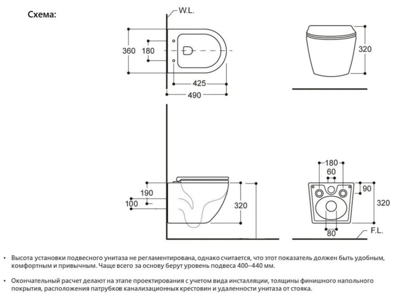 • Прилегание унитаза к стене:
