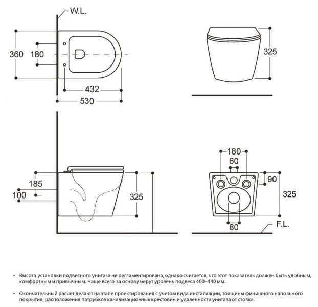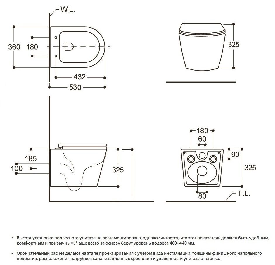 • Прилегание унитаза к стене: