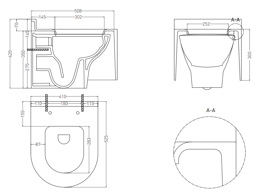 • Прилегание унитаза к стене: