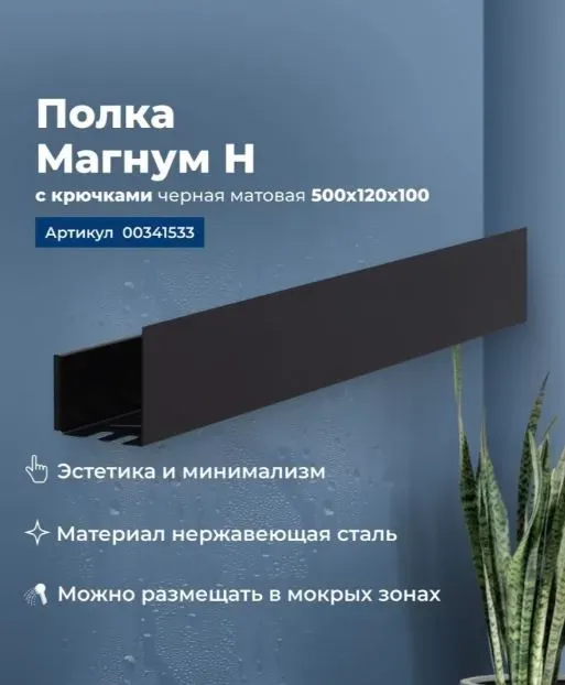 Полка Aquanet Магнум Н 50x12 черная матовая, с крючками — это компактное и стильное решение для организации пространства, которое сочетает в себе функциональность и современный дизайн. Вот ее основные характеристики и преимущества: