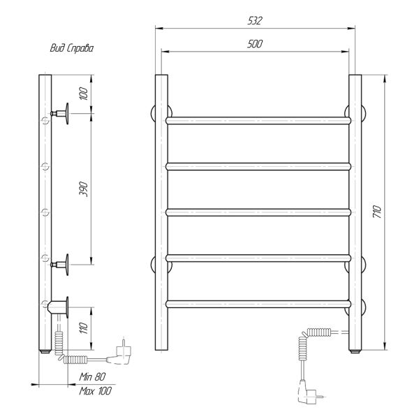 Полотенцесушитель электрический Domoterm Аврора 109-5 EK R/EK L, ширина 50 см, высота 70 см, подключение слева/справа, черный матовый, DMT 109-5 50x71 ЧРН EK R/DMT 109-5 50x71 ЧРН EK LЭлектрический полотенцесушитель с ТЭНом представляет собой современный обогревательный электроприбор из нержавеющей стали. Устройство потребляет небольшое количество электроэнергии и может работать на протяжении длительного периода времени без отключения от сети; является дополнительным источником отопления в комнате, можно использовать в ванных комнатах для сушки белья, полотенец. Полотенцесушители поставляются в сборе, укомплектованы монтажными стойками и готовы к установке. Толщина 1,5 мм. Вертикальные стойки имеют диаметр 32мм., горизонтальные перекладины выполнены из трубы диаметром 18мм