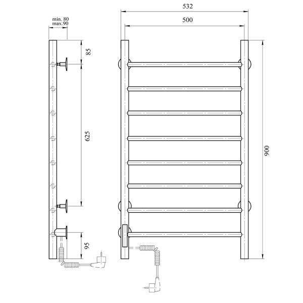М/о расстояние (межосевое расстояние): 500Количество перекладин: 8Коллекция: АврораТип: электрическиеЦвет: хромМощность, Вт: 70Ширина (мм): 532Высота (мм): 900Глубина (мм): 90/80Вес: 5,15Объем: 0,0425Тэн/подключение: слеваСтрана: РоссияГарантия: 2 года