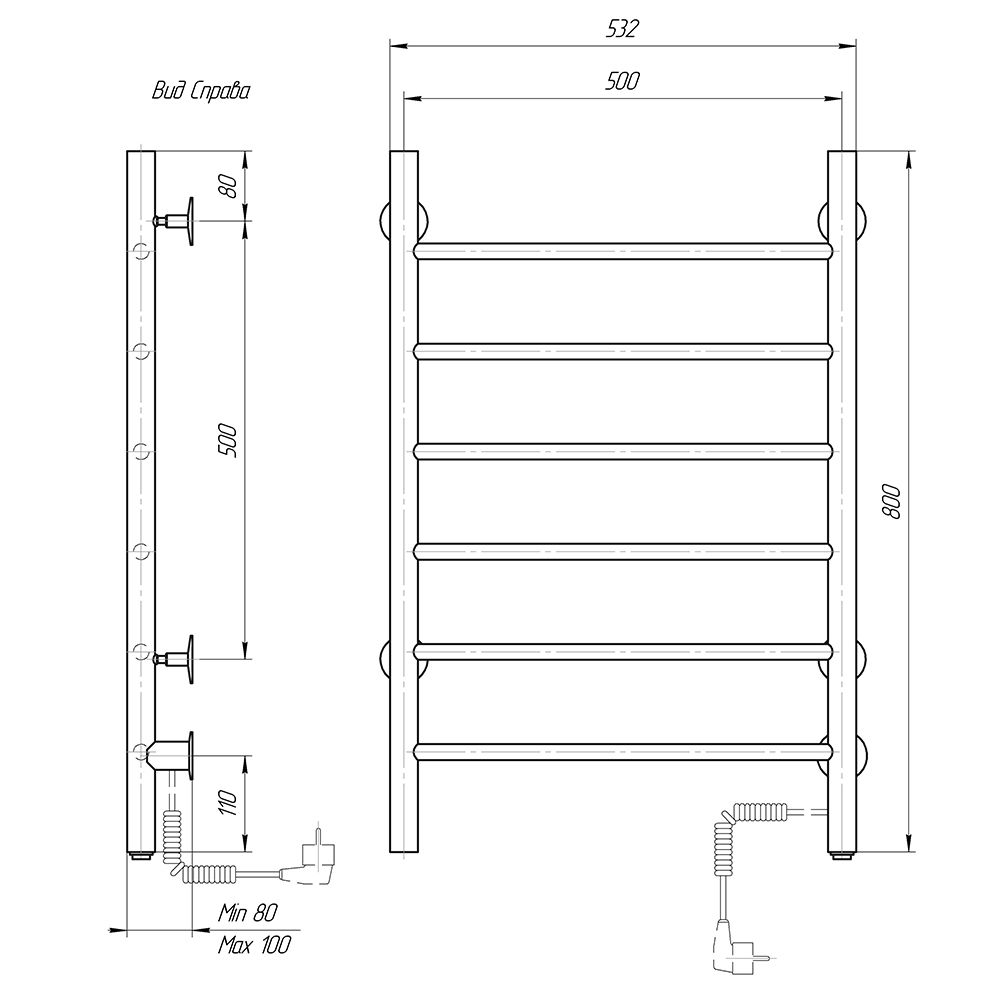 Количество перекладин: 6Коллекция: КлассикТип: электрическиеЦвет: белыйМощность, Вт: 72Ширина (мм): 532Высота (мм): 800Глубина (мм): 80-100Вес: 4,86Объем: 0,07425Тэн/подключение: справаСтрана: РоссияГарантия: 2 года