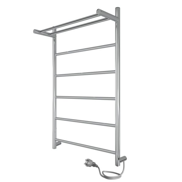 Электрический энергосберегающий полотенцесушитель торговой марки INDIGO Line с пятью прямыми перекладинами и полкой. Ширина изделия 50 см. Витой шнур органично и аккуратно смотрится с полотенцесушителем. Кнопка вкл/выкл. находится на вилке. Возможно как правостороннее подключение, так и левостороннее.