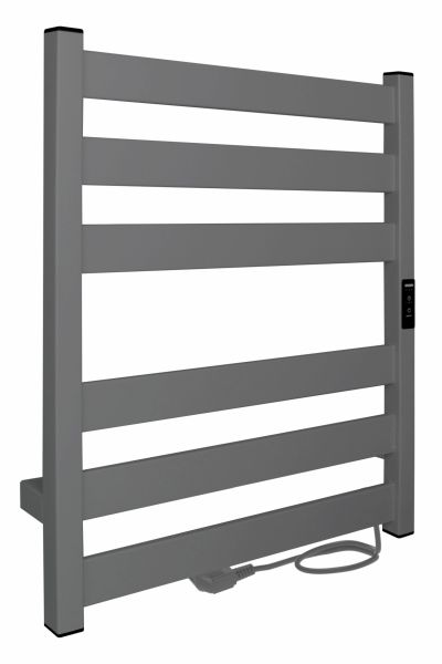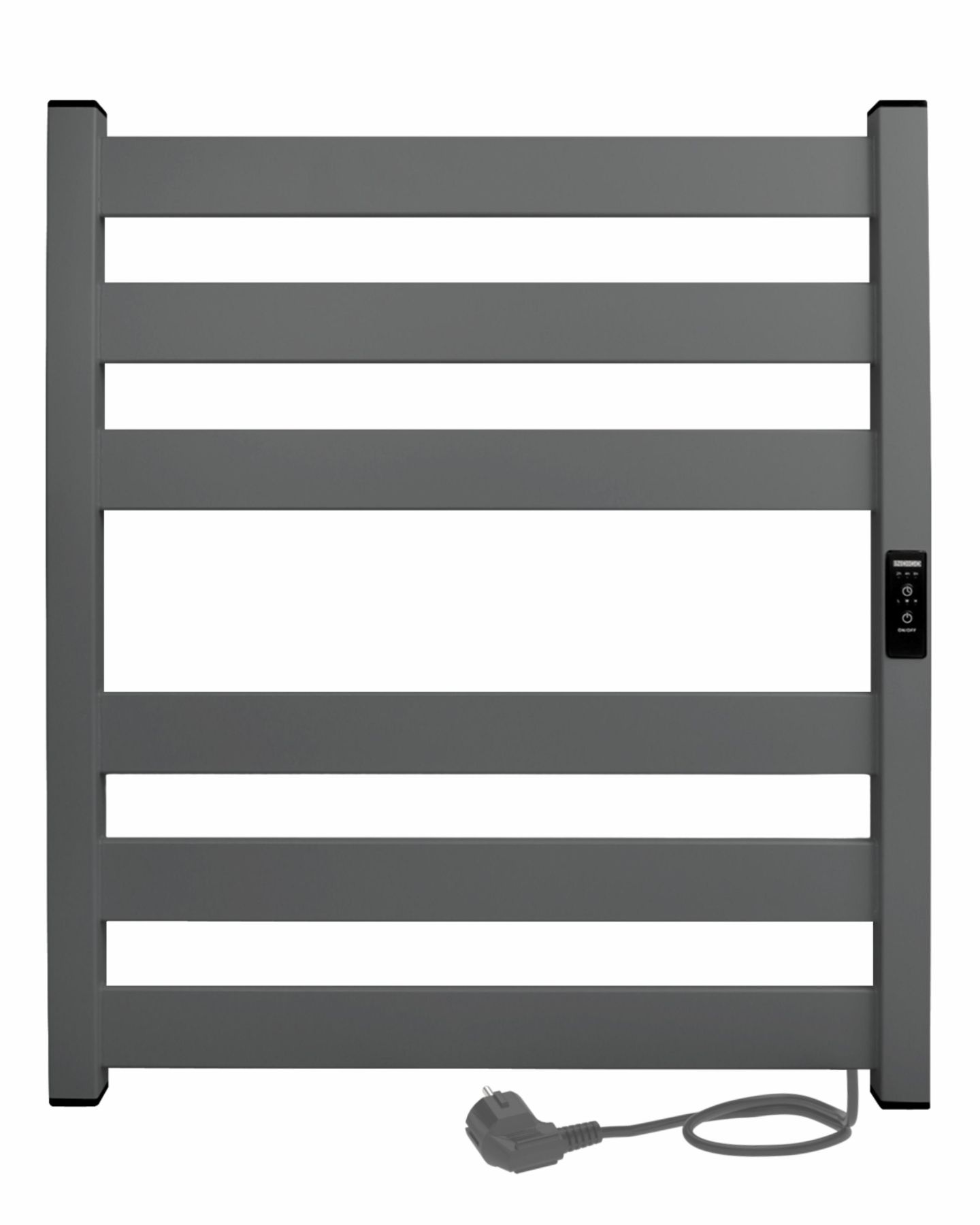 Полотенцесушитель Oktava Slim 5 в сером матовом оттенке с терморегулятором и таймером для отключения. Терморегулятор имеет три температурных режима: 40,45, 50 градусов, а таймер отключения рассчитан на интервал 2, 4, 6 часов.