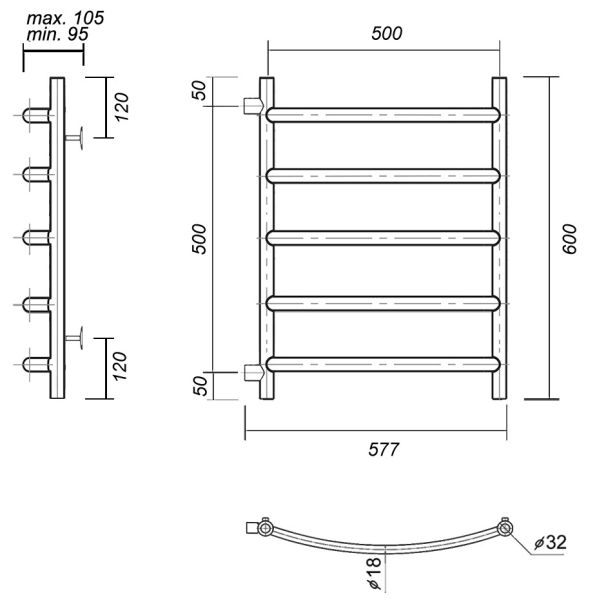 М/о расстояние (межосевое расстояние): 500Количество перекладин: 5Коллекция: КалипсоТип: водяныеЦвет: хромШирина (мм): 577Высота (мм): 600Глубина (мм): 105-95Вес: 4,5Объем: 0,00363Тэн/подключение: боковоеСтрана: РоссияГарантия: 10 лет