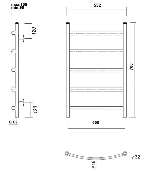 М/о расстояние (межосевое расстояние): 500Количество перекладин: 5Коллекция: КалипсоТип: водяныеЦвет: хромШирина (мм): 532Высота (мм): 700Глубина (мм): 105-95Вес: 4,07Объем: 0,062Тэн/подключение: нижнееСтрана: РоссияГарантия: 10 лет