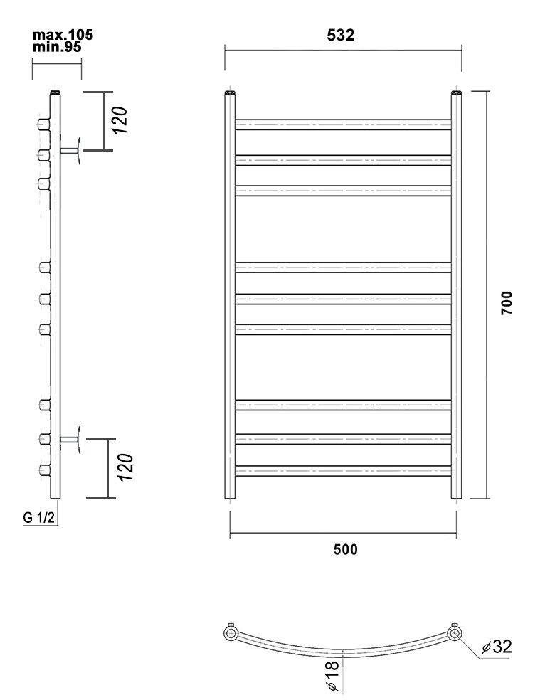 Подключение к ГВС нижнее, резьба внутренняя, 1/2".М/о расстояние (межосевое расстояние): 500Количество перекладин: 9Коллекция: КалипсоТип: водяныеЦвет: хромШирина (мм): 532Высота (мм): 700Глубина (мм): 105-95Вес: 4,6Объем: 0,063Тэн/подключение: нижнееСтрана: РоссияГарантия: 10 лет