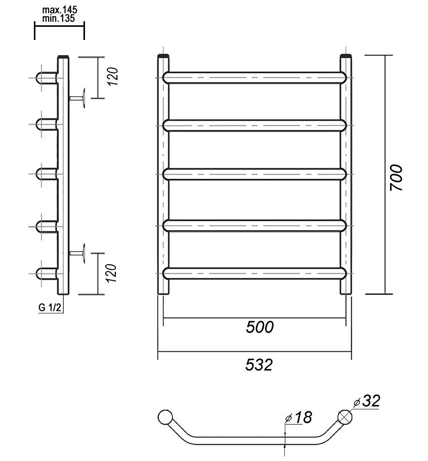 М/о расстояние (межосевое расстояние): 500Количество перекладин: 5Коллекция: ЛаураТип: водяныеЦвет: хромШирина (мм): 532Высота (мм): 700Глубина (мм): 145-135Вес: 4,83Объем: 0,062Страна: РоссияГарантия: 10 лет