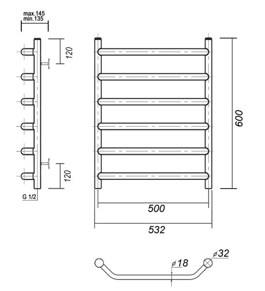 М/о расстояние (межосевое расстояние): 500Количество перекладин: 6Коллекция: ЛаураТип: водяныеЦвет: хромШирина (мм): 532Высота (мм): 600Глубина (мм): 145-135Вес: 5,1Объем: 0,0681Страна: РоссияГарантия: 10 лет