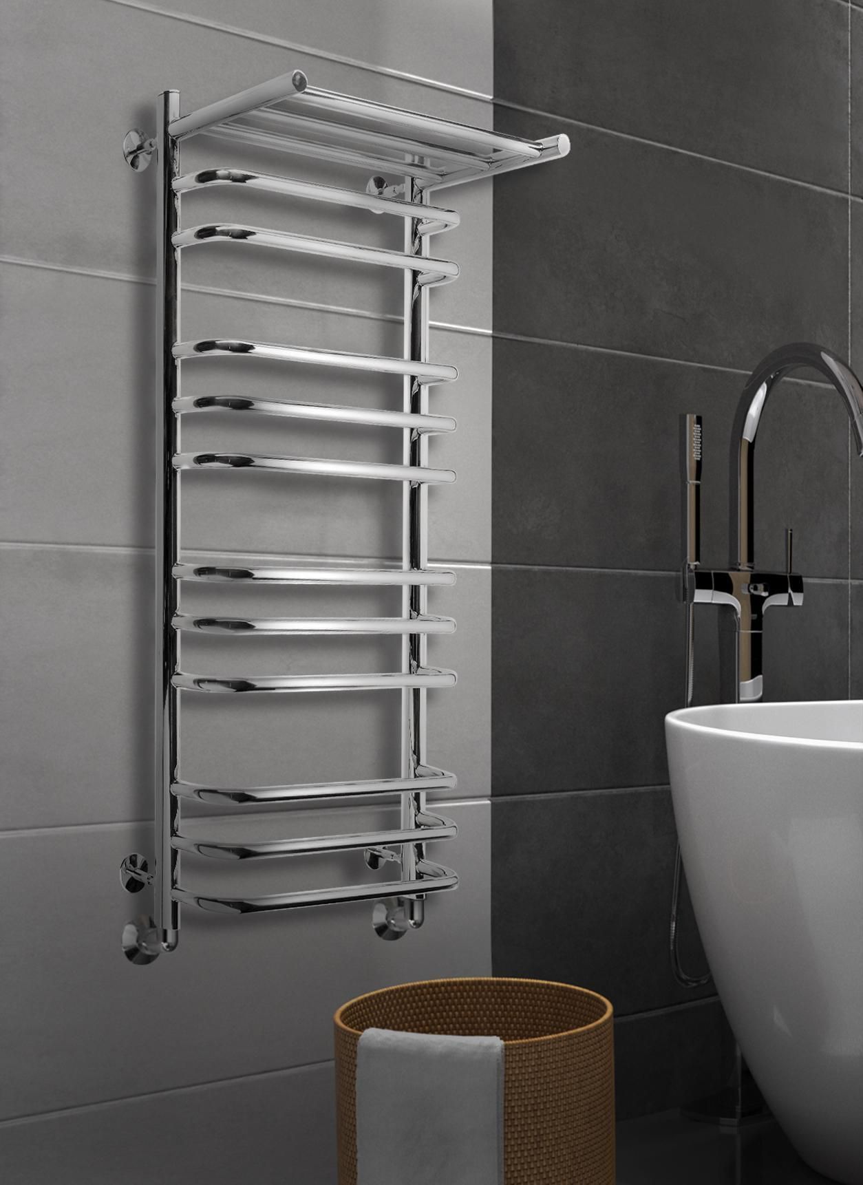 Тщательная полировка изделия придает ей великолепный оттенок «хром». Полотенцесушитель с полкой водяной удобен в использовании, на полочке можно хранить текстильные изделия для просушки, обеспечат круглосуточно теплые полотенца.