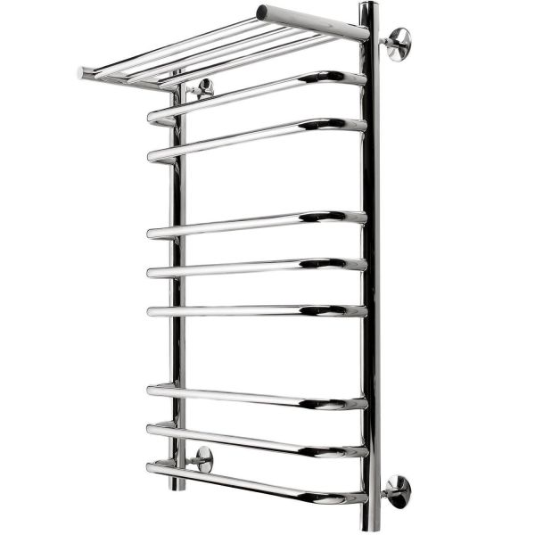 Тщательная полировка изделия придает ей великолепный оттенок «хром». Полотенцесушитель с полкой водяной удобен в использовании, на полочке можно хранить текстильные изделия для просушки, обеспечат круглосуточно теплые полотенца.