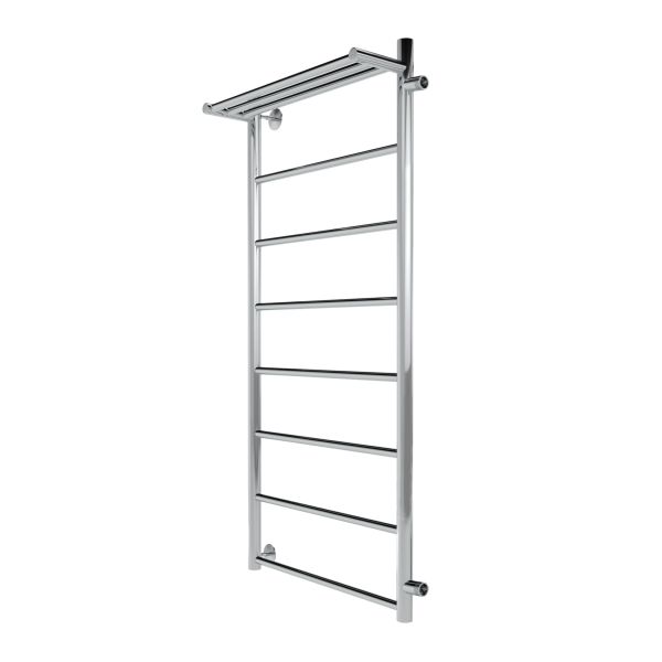 Водяной полотенцесушитель в форме Лесенки Line с полочкой – это оригинальный элемент не только с прямыми или накладными перекладинами, но и дополнительной полкой для полотенец, халатов и других мелочей.