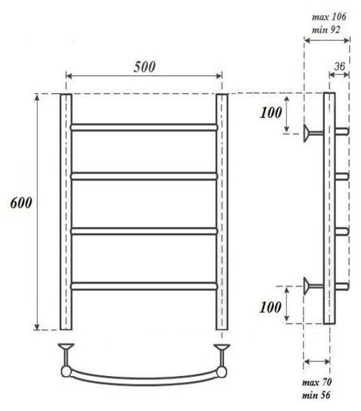 Полотенцесушитель - 1 шт, кронштейны для крепления к стене - 4 шт, кран Маевского - 1 шт, заглушка декоративная - 1 шт, паспорт/гарантийный талон - 1 шт