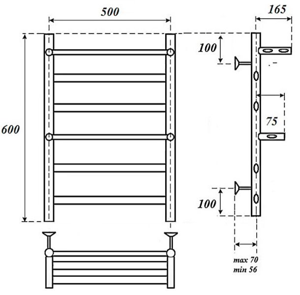 Водяные полотенцесушители Артемида выполнены из нержавеющей стали AISI 304L с толщиной стенки 2,0 мм в трех размерах 500x600, 500х800 и 500х1000 мм.