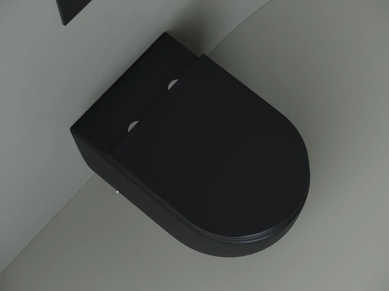 Напольный пристенный унитаз-соло Metropol Rimless, глубокий смыв, горизонтальный (универсальный) выпуск, с крепежом, ультра тонким с сидением и крышкой с функцией плавного закрытия, дюропласт (цвет чёрный матовый)