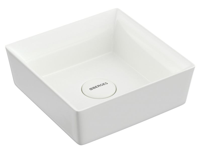 Накладная раковина из санфарфора Berges Mascon размером 38х38х12,5 см.Квадратной формы, без отверстия под смеситель, глянцевая белая.Керамическая крышка слива в комплекте.