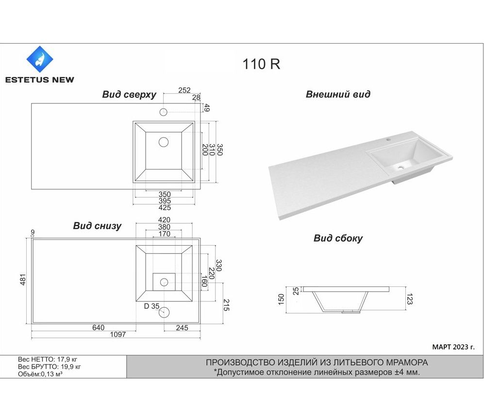 Раковина для мебели Style Estetus Даллас СС-00002393 правая 110 смРазмер(ШхГхВ): 110,2 х 48,2 х 14,5 см