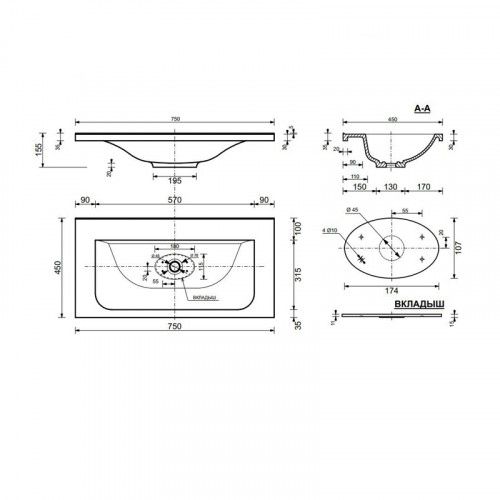 Раковина для мебели Style Line Бали СС-00000405Размеры (ДхШхВ): 75.0см х 45.0см х 15.0см