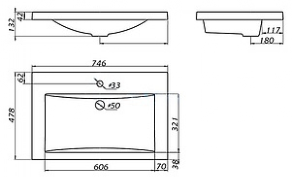 - Диаметр отверстия под смеситель: 33 мм