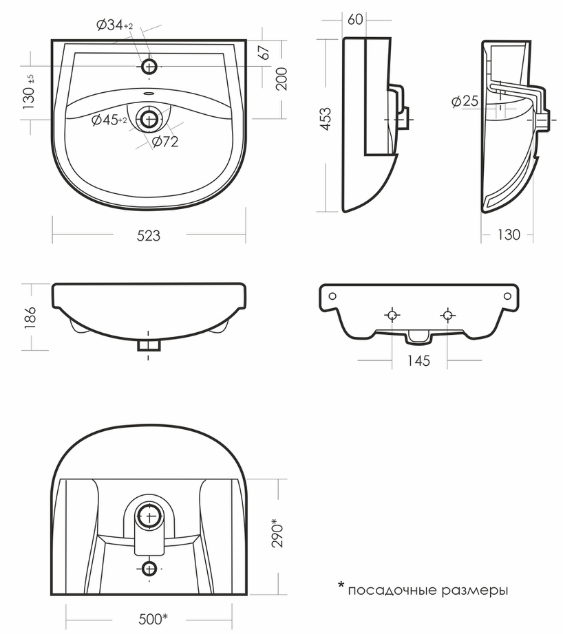Размеры умывальника: 523 x 453 x 186