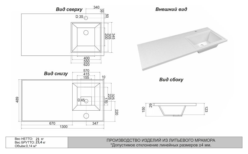 Тип: раковиныПо форме: прямоугольныеРазмер, мм (ШxГxВ): 1298x482x137Размер в упаковке, мм (ШxГxВ): 1328x512x167Цвет: белыйВес с упаковкой, кг: 27.76По монтажу: мебельнаяМатериал: литьевой мраморОсобенности: установка над стиральной машиной, со столешницей