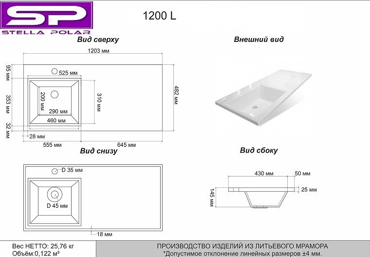 Раковина над стиральной машиной Stella Polar Мадлен 120см левая чёрный мрамор SP-00001196 купить