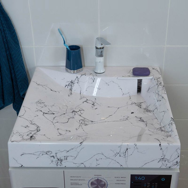 Раковина в ванную комнату для установки над стиральной машинкой. Крепится на кронштейны, которые входят в комплект поставки. Верхний слой высококачественного гелькоута образует декоративно-защитное покрытие. Изысканный цвет мрамора украсит любую ванную комнату. Основные характеристики: