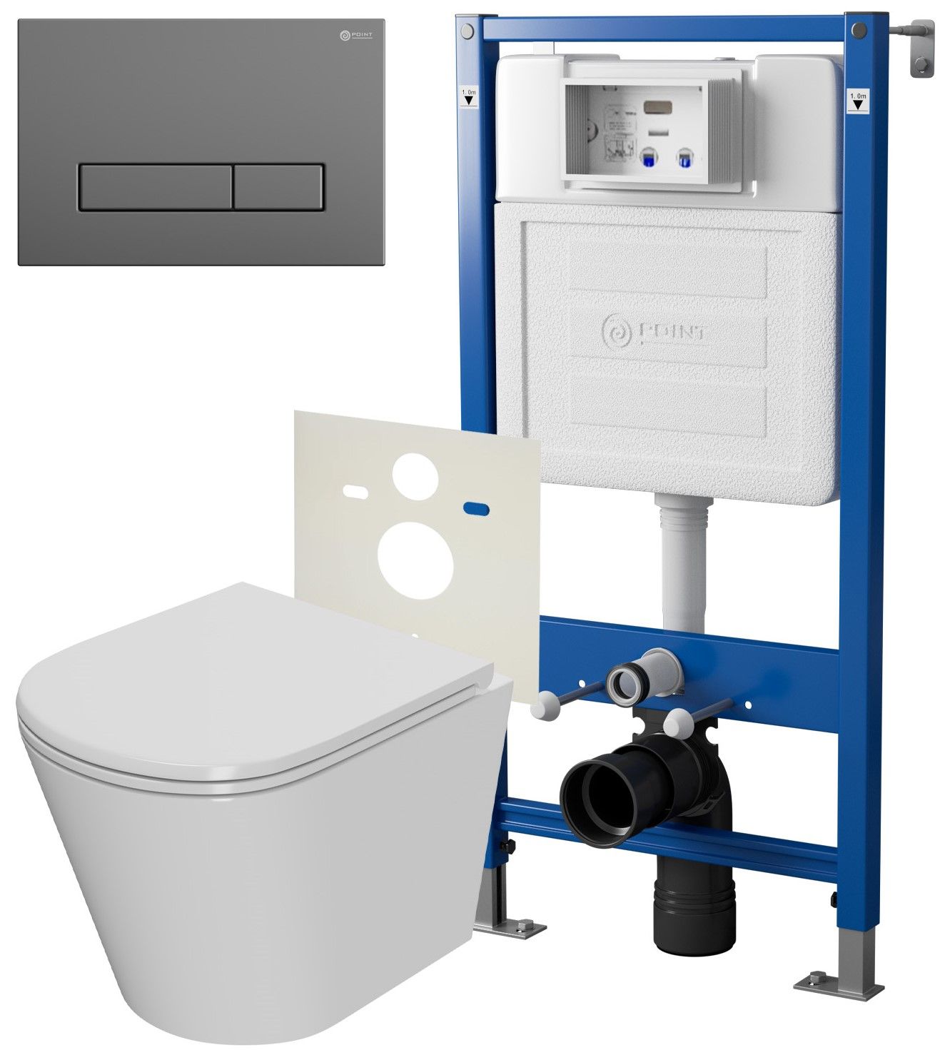 Сет: Система инсталляции Point Элемент для подвесного унитаза PN45120 + Клавиша смыва для инсталляции Point Меркурий, цвет графит, PN44831GM + Унитаз подвесной Point Виктория безободковый, сиденье микролифт PN41061